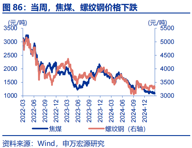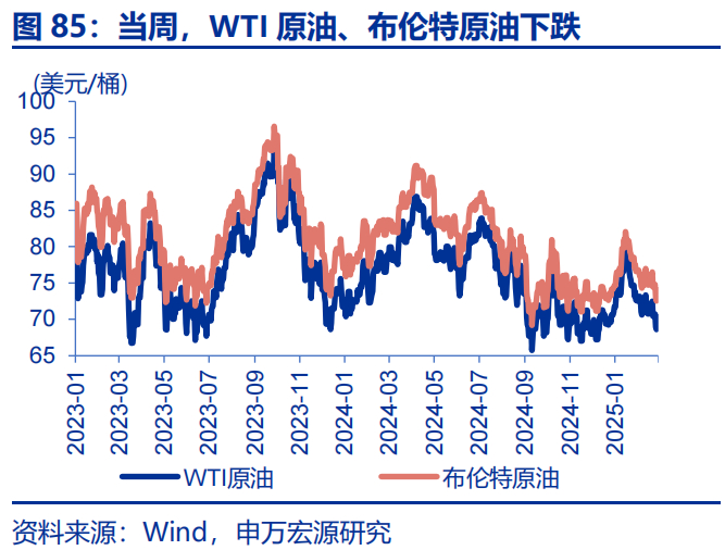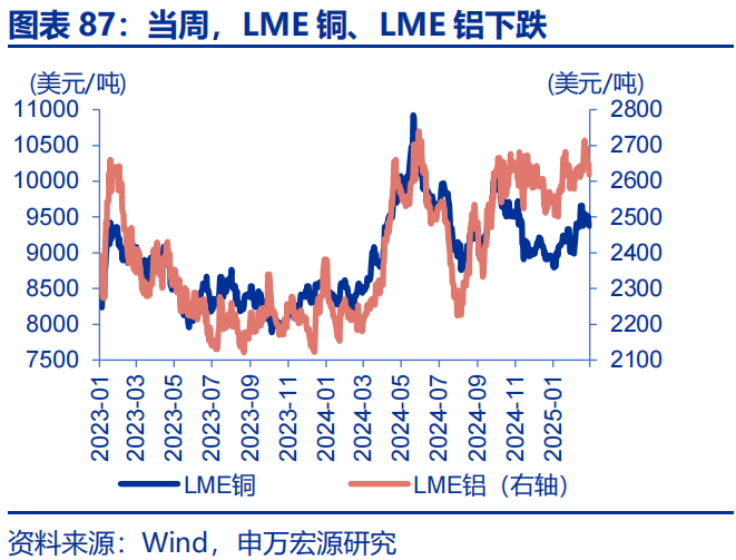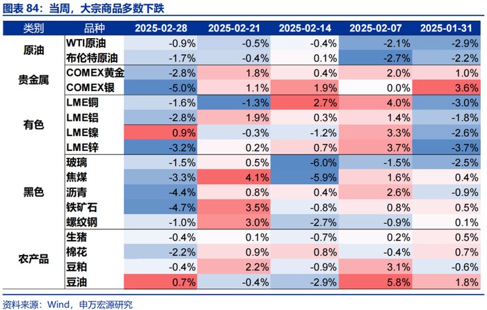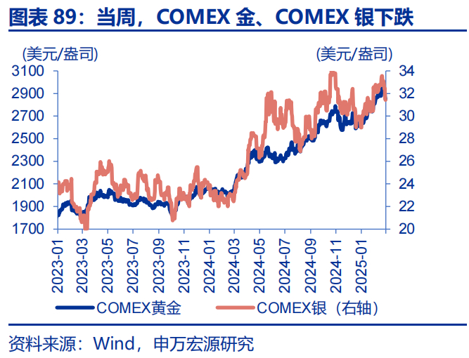 当周,贵金属、有色多数下跌。LME铜下跌1.6%至9376美元/吨,LME铝下跌2.8%至2618美元/吨;通胀预期下行4bp至2.38%,COMEX黄金下跌2.8%至2847.9美元/盎司,COMEX银下跌5.0%至31.4美元/盎司;10Y美债实际收益率下行14bp至1.86%。