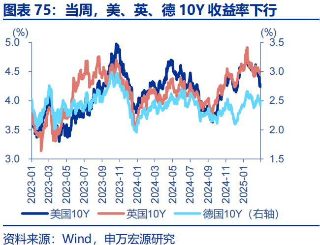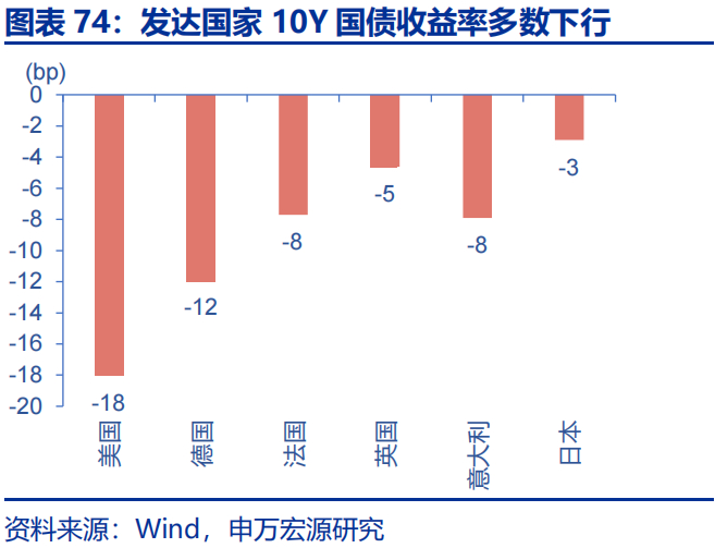 当周,发达国家10年期国债收益率多数下行。美国10年期国债收益率下行18bp至4.24%,德国10年期国债收益率下行12bp至2.42%,法国10年期国债收益下行8bp至3.14%,英国10年期国债收益率下行5bp至4.48%,意大利10年期国债收益率下行8bp至3.47%,日本10年期国债收益率下行3bp至1.40%。