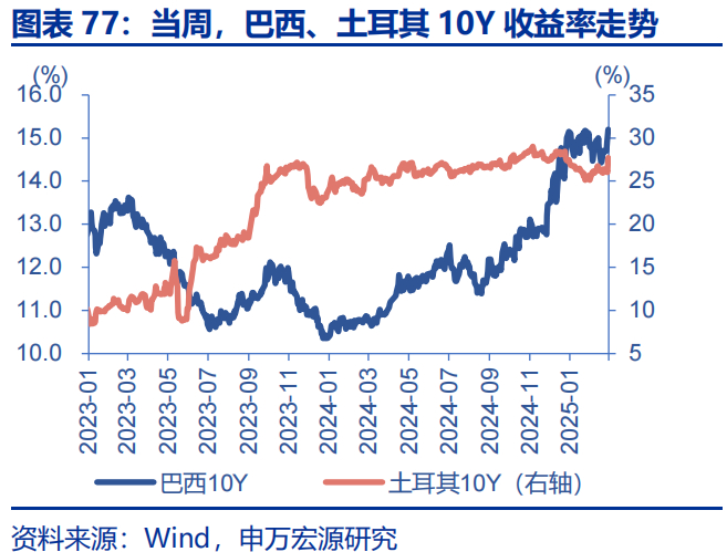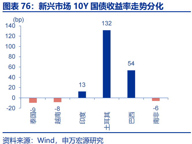 当周,新兴市场10年期国债收益率走势分化。泰国下行9bp至2.20%,越南下行8bp至3.13%,印度上行13bp至6.83%,土耳其上行132bp至27.71%,巴西上行54bp至15.20%,南非下行6bp至10.53%。