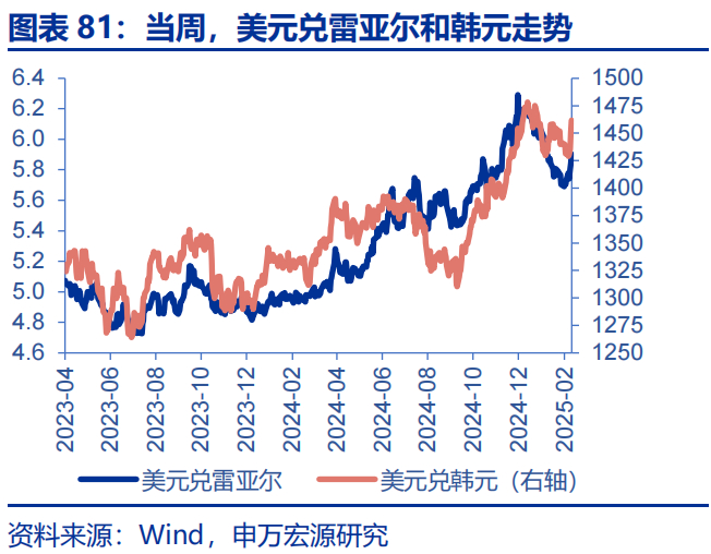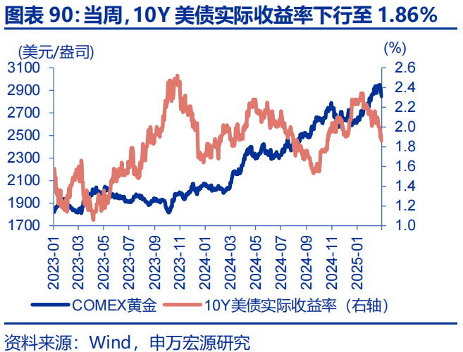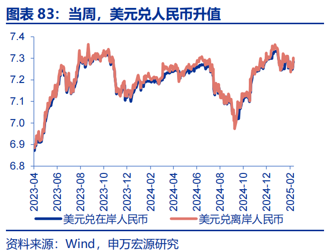 美元指数走强,黄金大幅回撤。当周,纳指下跌3.5%,日经225下跌4.2%;10Y美债收益率下行18bp至4.42%;美元指数上涨0.9%至107.56,离岸人民币贬至7.2950;WTI原油下跌0.9%至69.8美元/桶,COMEX黄金下跌2.8%至2847.9美元/盎司。