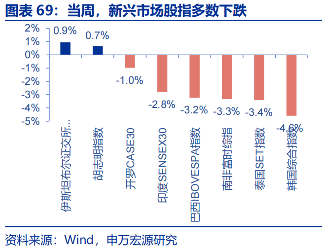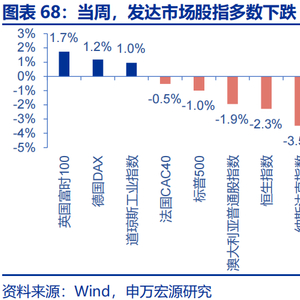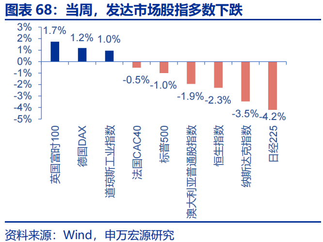当周,发达市场股指多数下跌,新兴市场股指多数下跌。发达市场股指,英国富时100、德国DAX、道琼斯工业指数分别上涨1.7%、1.2%和1.0%,日经225、纳斯达克指数、恒生指数分别下跌4.2%、3.5%和2.3%;新兴市场股指,伊斯坦布尔证交所全国30指数上涨0.9%,韩国综合指数、泰国SET指数、南非富时综指、巴西IBOVESPA指数分别下跌4.6%、3.4%、3.3%和3.2%。