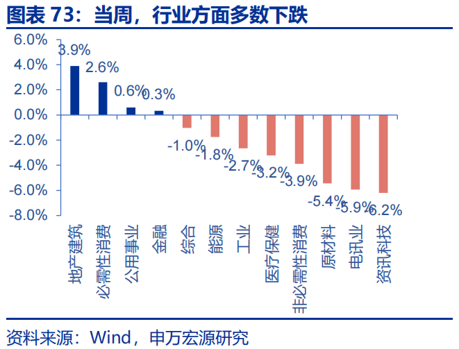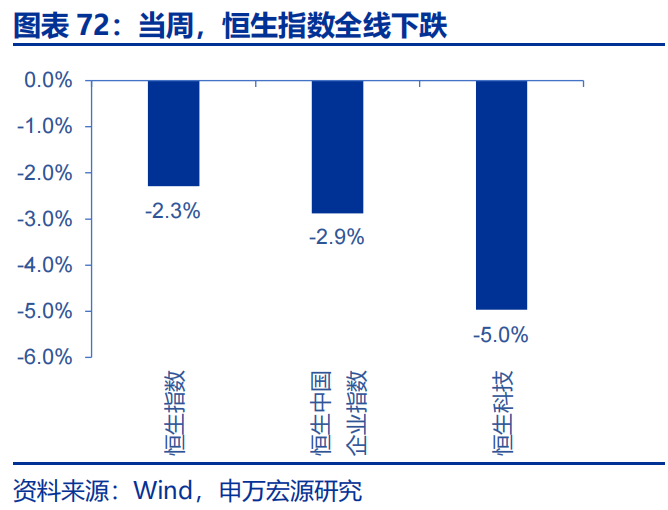 当周,恒生指数全线下跌,行业方面多数下跌。恒生指数、恒生科技、恒生中国企业指数分别下跌2.3%、5.0%和2.9%。行业方面,地产建筑、必需性消费分别上涨3.9%和2.6%,资讯科技、电讯业、原材料分别下跌6.2%、5.9%和5.4%。