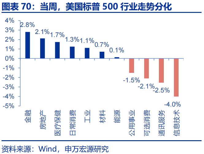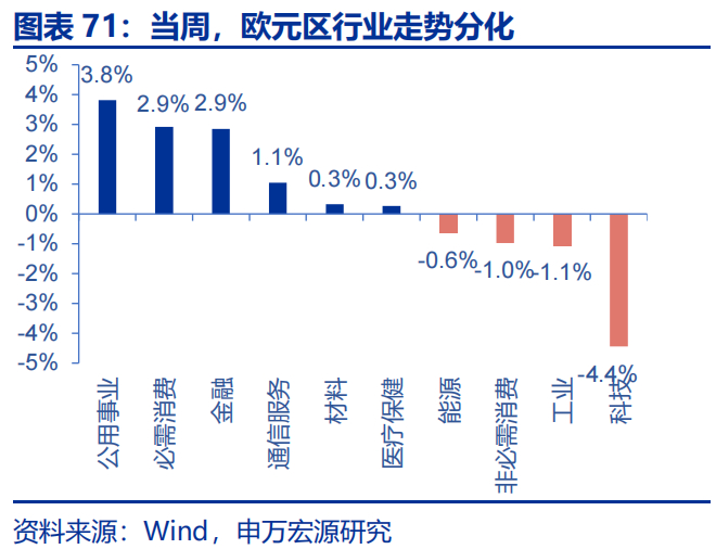 当周,美国标普500行业走势分化。金融、房地产、医疗保健分别上涨2.8%、2.1%和1.7%,信息技术、通讯服务、可选消费分别下跌4.0%、2.5%和2.1%;欧元区行业走势分化,公用事业、必需消费、金融分别上涨3.8%、2.9%和2.9%,科技、工业、非必需消费分别下跌4.4%、1.1%和1.0%。