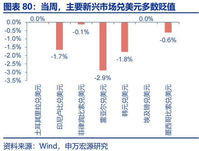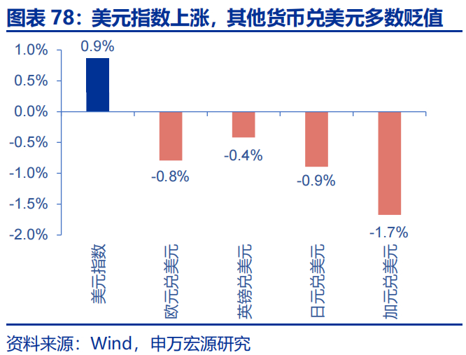 当周,美元指数上涨,其他货币兑美元多数贬值。美元指数上涨0.9%至107.56,欧元兑美元贬值0.8%,英镑兑美元贬值0.4%,日元兑美元贬值0.9%,加元兑美元贬值1.7%。主要新兴市场货币兑美元多数贬值,印尼卢比兑美元贬值1.7%,巴西雷亚尔兑美元贬值2.9%,韩元兑美元贬值1.8%。