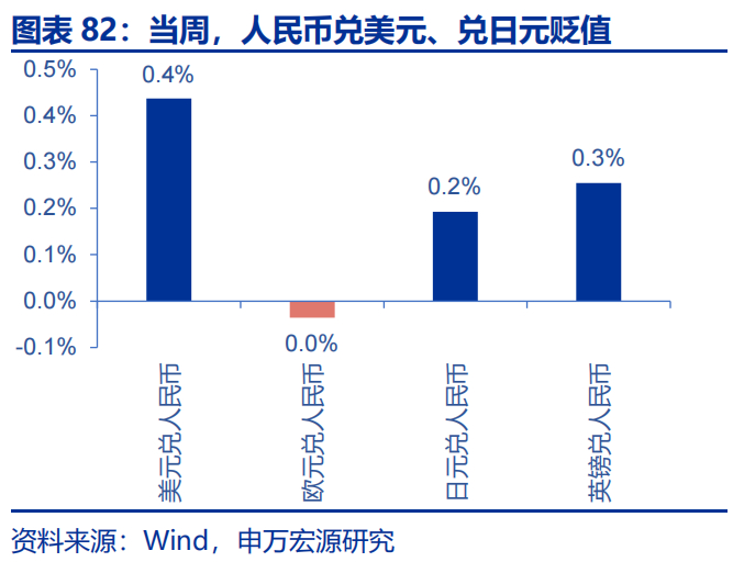 当周,人民币兑美元、兑日元贬值。美元兑人民币升值0.4%,美元兑在岸、离岸人民币汇率分别为7.2833和7.2950,日元兑人民币升值0.2%,欧元兑人民币持平前值,英镑兑人民币升值0.3%。