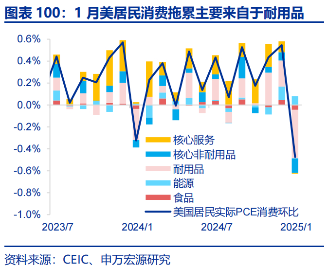 1月美国居民实际可支配收入环比0.6%,前值0.2%,主要拉动来自于转移收入提升。但是,1月美国居民实际PCE消费环比-0.5%,低于市场-0.1%的预期,其中主要为耐用品消费拖累,显示美国居民消费意愿正在走弱,需持续关注。