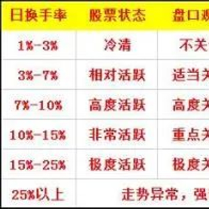 换手率过高的时候需要特别关注,一般小盘股换手率超过10%,中盘股超过15%,大盘股超过20%的时候,则需要高度警惕了。对于换手率的高低,有个不成文的规定,即大于或等于15%属于高换手,在5%与15%之间属于正常换手,在小于或等于5%则属于低换手。针对不同的日换手率分析,可参考下表:
