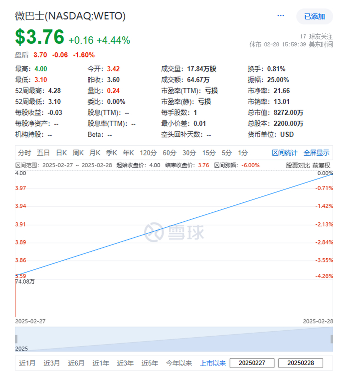 截至首日(2025年2月28日)收市,微巴士(WETO)每股收报3.76美元,较IPO发行价跌6%,目前市值约8,272万美元。