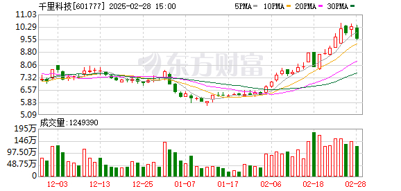 截至2月28日收盘,千里科技股价报9.57元/股,总市值为432.7亿元。