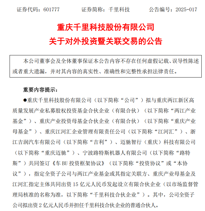 公告显示,千里科技拟与重庆两江新区高质量发展产业私募股权投资基金合伙企业(有限合伙)(以下简称两江产业基金)、重庆产业投资母基金合伙企业(有限合伙)(以下简称重庆产业母基金)、重庆江河汇企业管理有限责任公司(以下简称江河汇)、宁波路特斯机器人有限公司(以下简称路特斯)、浙江吉润汽车有限公司、迈驰智行(重庆)科技有限公司签订《车BU投资框架协议》。