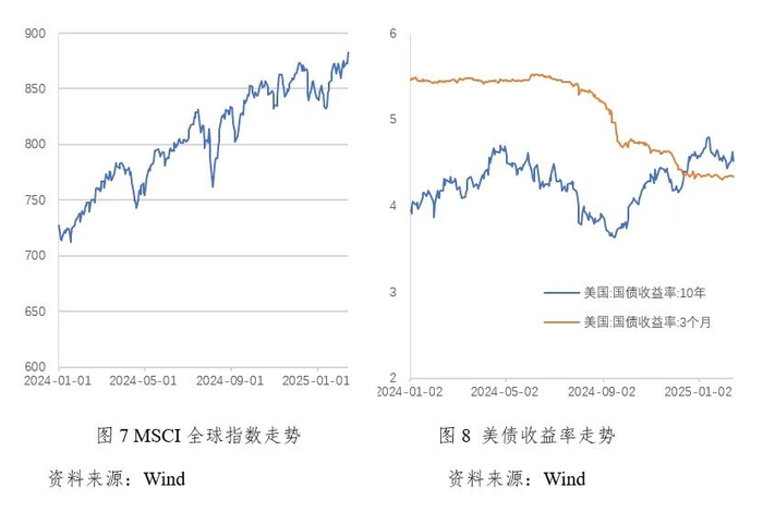 尽管多数国家因通胀回落和经济增长放缓而开启了降息周期,美国却因经济和通胀表现出较强韧性,从而放缓了降息步伐。这一差异导致美元在全球宽松周期中意外走强。欧元在美元指数中的权重超过50%,由于美国的利率水平(4.25%~4.5%)明显高于欧元区(3.0%),加之美国经济和通胀的韧性更强,市场对美联储进一步降息的预期减弱,这些因素共同推动了美元指数的强劲上涨。此外,特朗普当选后,全球政策不确定性显著增加,避险情绪进一步推高了美元的价值。2025年初,欧元区和英国继续降息,而美联储按兵不动,进一步巩固了美元强势的市场预期。