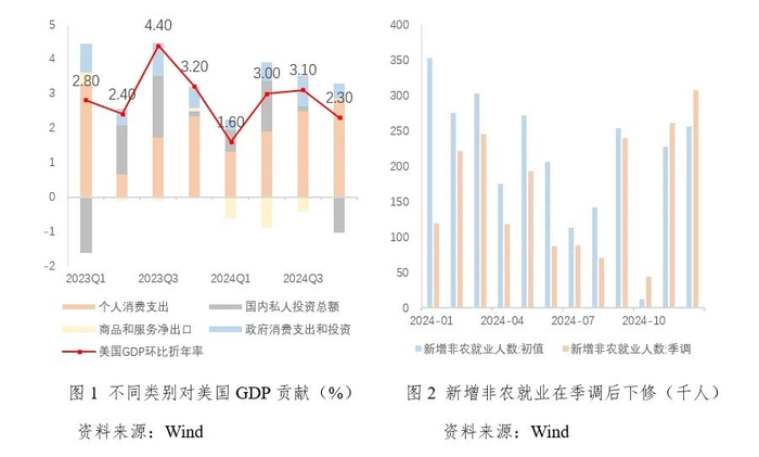 美国2024年的经济韧性超出了市场预期,主要得益于个人消费支出的强劲增长。尽管2024年美国的净出口和政府消费投资远弱于2023年,且国内私人投资在下半年因对特朗普政策不确定性的担忧而同比回落,但居民消费支出的稳定增长仍然是支撑美国经济韧性的关键因素。然而,美国居民消费的增长也面临着一些矛盾和隐忧。首先,新增非农就业数据的频繁下修正在影响居民的消费信心。虽然去年上半年新增非农就业数据屡超预期,提振了消费者信心,但在季末和年末季调后整体大幅下修。其次,时薪上涨但工时减少导致美国居民收入仅温和增长。尽管美国平均时薪增速保持在历史高位,但由于工作小时数的下降,整体收入增长并未显著提升。根据美国经济分析局的数据,2024年美国人均个人收入增长仅为1.93%,低于通胀率(2.9%)。最后,美国家庭债务持续攀升,债务逾期率有所回升。2024年第四季度,美国家庭债务余额首次突破18万亿美元;90天以上的贷款拖欠率结束了连续十三个季度低于2%的历史,在年底重新上升至2%。不断增加的家庭债务压力将对未来居民消费的增长构成挑战。