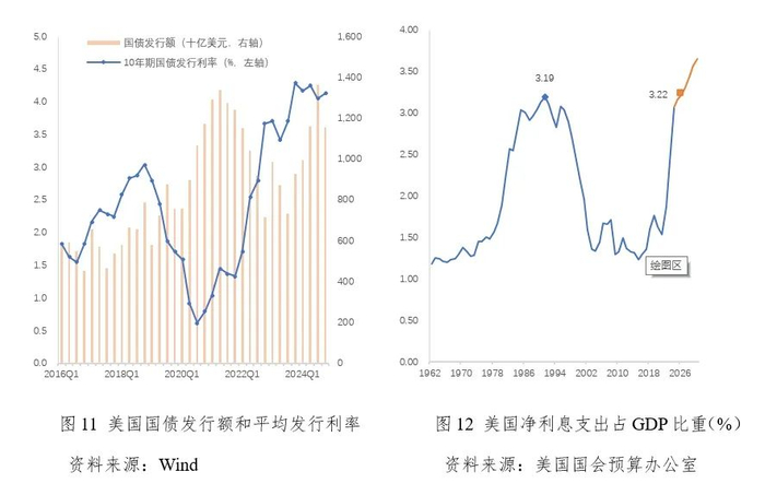 根据2024年10月国际货币基金组织发布的《财政监测报告》,全球公共债务在2024年预计将超过100万亿美元,并面临短期内大幅上升的风险。在全球经济低增长成为常态的背景下,对财政可持续性的担忧正在威胁宏观金融稳定。然而,各国对债务问题的看法存在显著差异,甚至在同一国家的不同政党之间也存在较大分歧,这为共同应对全球增长、债务和金融稳定问题带来了障碍。在美国,财政赤字成为特朗普推行扩张性政策的重要制约因素,市场对相关政策能否如期实施持怀疑态度。美国在2022年至2024年间累计发行了超过12万亿美元的国债,这些国债的发行利率较高,高规模和高利率所产生的利息支付负担成为未来美国财政平衡的隐患。根据美国国会预算办公室(CBO)的预测,2026年利息支付总额将达到GDP的3.22%,创下自第二次世界大战以来的最高水平。在欧洲,法国面临着与美国类似的债务困境,2024年其公共债务占GDP的比例达到了欧盟规定的上限110%。迫于压力,法国政府宣布将在2025年削减公共预算300亿欧元。德国则继续秉持审慎的财政传统,将财政赤字率控制在3%以下,通过削减非必要支出和调整支出结构来维持财政平衡,但这也导致了经济负增长,引发了不同政党之间的激烈争论。2024年是选举大年,许多候选人承诺推行扩张性财政政策,这进一步推高了全球公共债务。然而,政府债务对经济增长的拉动作用并未达到预期效果。因此,各国需要更加审慎地平衡短期经济刺激措施与长期财政可持续性。