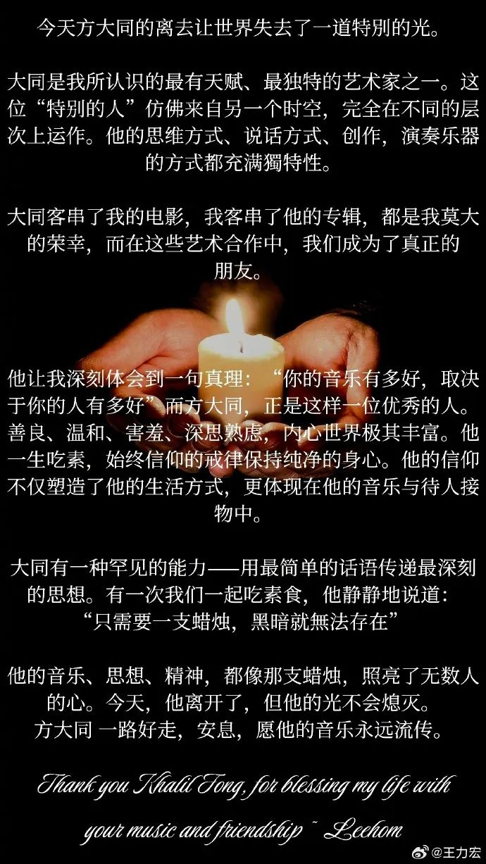 王力宏发文悼念:今天方大同的离去让世界失去了一道特别的光。