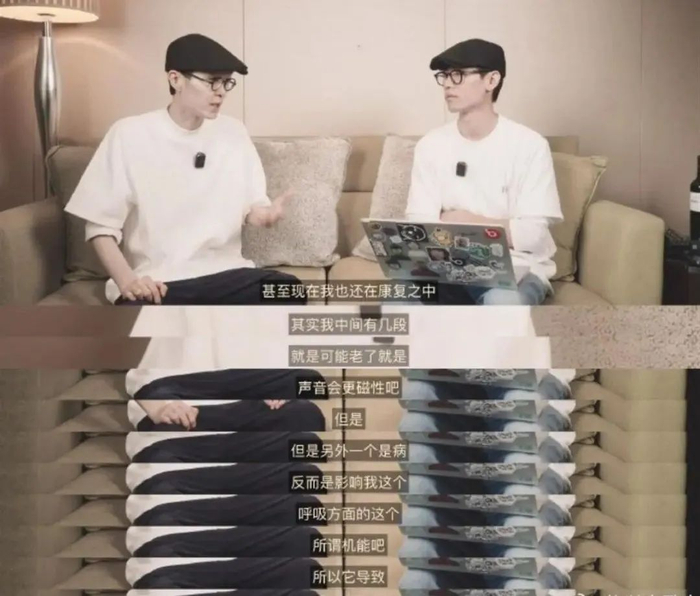 在与博主hopico的谈话节目中,方大同表示,之前一段时间消失,生病是一个主要原因。而关于声音变化,一方面是因为自己年龄增长,“可能是老了”,另一方面因为生病会影响呼吸方面的机能,导致声音出现变化。