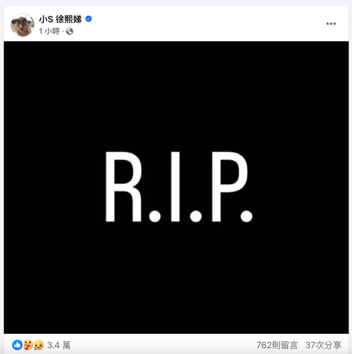 1日晚,小S发声悼念方大同:“R.I.P.”。