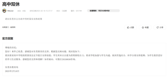 广东某地市阳光问政平台上,出现多条关于高中双休的留言。