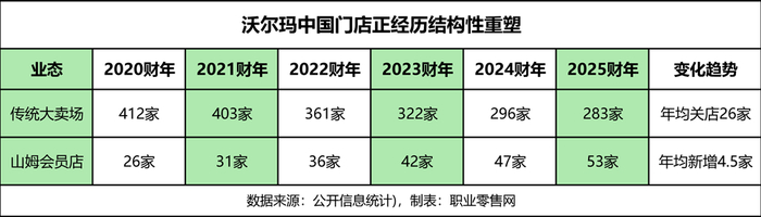 根据沃尔玛最新财报显示,截至2025年1月31日,沃尔玛在中国的大卖场门店数量相比前一年减少了13家,降至283家;山姆会员店则增加了6家,达到53家。