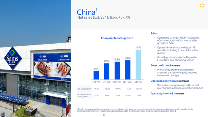 其中,由于中国农历新年购物季较往年提前,受此提振,沃尔玛该季度在中国的电子商务净销售额同比增长34%,而此前三个季度涨幅为23%、23%和25%。这一表现凸显出沃尔玛中国在数字化转型方面的显著成效。