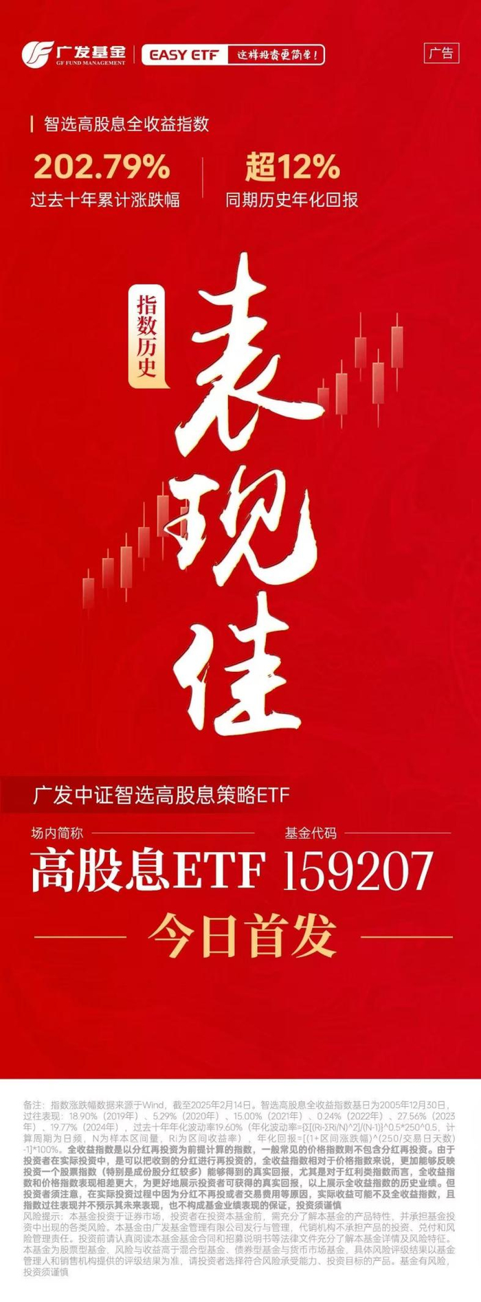 在此背景下,广发基金也适时推出广发中证智选高股息策略交易型开放式指数证券投资基金(简称“高股息ETF”,代码:159207),该基金于2025年3月3日至3月21日公开发售,募集对象包括个人投资者、机构投资者及合格境外投资者等。基金首次募集规模上限为20亿元人民币,认购费率最高不超过0.80%。投资者可通过网下现金认购和网上现金认购两种方式进行认购,其中网下现金认购每笔最低5万份,网上现金认购每笔需为1000份或其整数倍。