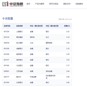 中证指数官网数据显示,截至2025年2月28日,该指数前十大权重股包括上海银行、君正集团、四川路桥、成都银行、南京银行、渝农商行、兴业银行、江苏金租、雅戈尔、北京银行。前十大权重股合计占比达34.71%。同时,按照中证二级行业分类,50只成份股中,银行高达10家,权重占比合计达31.68%,是该指数第一大权重行业;能源、耐用消费品分列二、三位,权重占比分别为11.39%、9.63%。