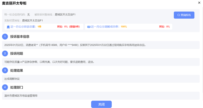 据悉,2025年1月22日,消费者吴某在麦吉丽开太专柜现场购买了非特殊用途化妆品。然而,购买后吴某怀疑所购产品存在质量问题,认为可能存在掺杂掺假、以假充真、以次充好等情况,遂向相关部门投诉,要求退赔费用并退货。