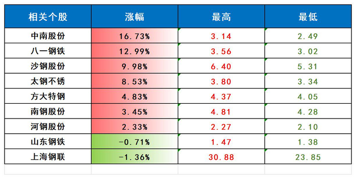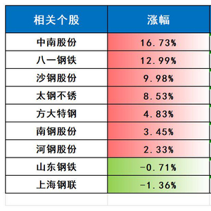 相关个股:中南股份(000717) 河钢股份(000709) 方大特钢(600507) 南钢股份(600282) 新钢股份(600782) 上海钢联(300226) 八一钢铁(600581) 同达创业(600647 )新兴铸管(000778) 三钢闽光(002110) 华菱钢铁(000932) 沙钢股份(002075) 凌钢股份(600231) 太钢不锈 (000825) 中信特钢(000708) 同飞股份(300990)