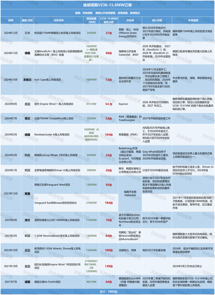 据风电观察统计,去除后期明确终止的项目外,维斯塔斯15MW海上风机总计获得了约1005台机组订单,这一数据与其公司官网给出的15GW的订单或首选供应商协议相当。