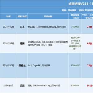 2024年底正式签约的日本男鹿潟上秋田海上风电项目315MW机组订单是维斯塔斯15MW风机在亚太的首单。