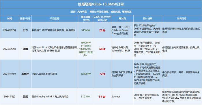 2024年,维斯塔斯15MW先后在美国市场、亚太地区实现突破。