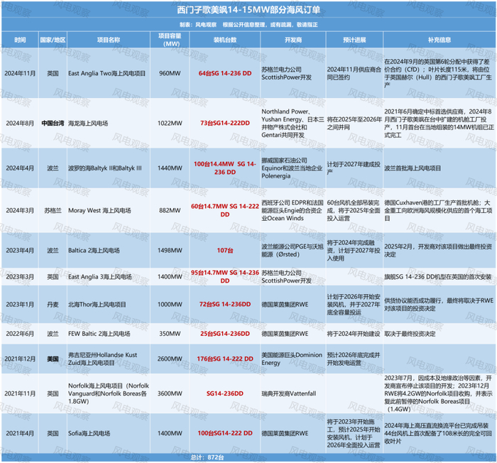 维斯塔斯V236-15.0 MW,西门子歌美飒SG 14.0-222 DD和SG 14-236 DD 风机订单盘点如下: