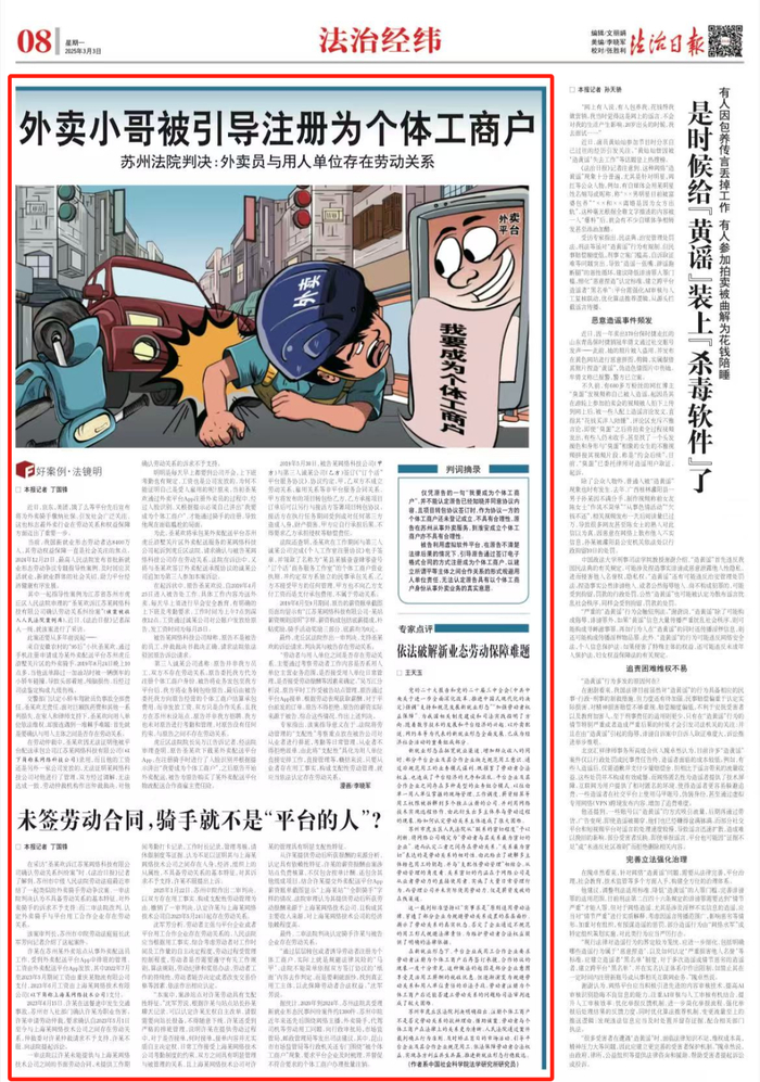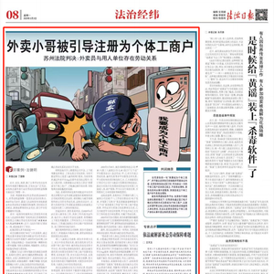 苏州市虎丘区法院判决明确指出,注册个体工商户不是否定劳动关系的抗辩理由。借助该案,劳动者与个体工商户在法律上的关系更为清晰。人民法院通过案件裁判确立行为准则,及时矫正盲目的市场活动,引导平台企业及其合作企业规范用工,依法保障劳动者合法权益,实现各方利益共生共赢,推进新就业形态行稳致远。