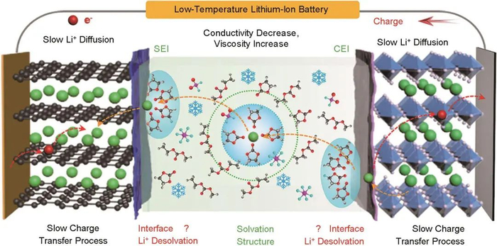 值得注意的是,与LIBs类似,SIBs在低温下性能恶化可能是正负极中Na+的扩散系数降低导致的。然而,Na+在电极中扩散速率的下降可能并不是电池性能差的根本原因。虽然正极和负极体相中的Na+扩散可以通过表面改性和杂原子掺杂来改善,越来越多的研究人员还是将重点转移到低温电解液设计上,这是因为电解液在正极和负极之间传输Na+方面发挥着关键作用,合适的电解液组成不仅有利于加快离子在其中的传输,还有利于稳定的电极/电解质界面的形成,在循环过程中稳定活性材料内部结构,进而提升整体的电化学性能。然而,在低温环境下,常温下适用的电解液特性及电极/电解液界面性质均会发生劣化,从而造成电池电化学性能衰减。简而言之,低温对电解液的致命影响,不仅体现在本体电解液性能恶化,例如电解液黏度增大,凝固导致电导率下降,还体现在电极-电解液界面动力学的下降上,例如界面阻抗增大,电荷转移阻抗增大等。因此,本文从电解液主体以及电极/电解液界面角度提出了改进电池低温性能的策略,着重讨论了提高界面动力学来改善电池低温性能的方法。