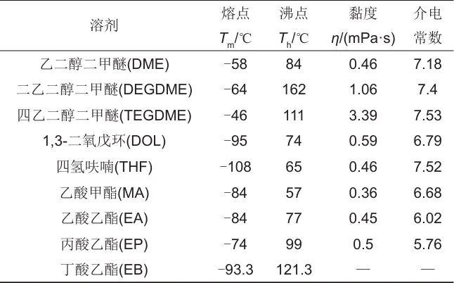 温度的降低导致了电解液黏度增大,使得电解液电导率降低,进而导致了Na+的传输速率、电荷转移速率降低。而电解质盐作为电解液的主要成分,是两个电极之间传输的电荷载体的一部分,决定了电解液的离子电导率,对于电解液的低温性质起着至关重要的作用。目前常用的电解质钠盐有六氟磷酸钠(NaPF6)、双氟磺酰亚胺钠(NaFSI)、四氟硼酸钠(NaBF4)和三氟甲磺酰亚胺钠(NaTFSI)等,不同的阴离子使得电解质盐的特性不同。例如,由于三氟甲磺酰亚胺钠(NaTFSI)在不同的溶剂中具有适宜的解离能力从而具有可观的电导率。并且由于TFSI-离子具有适中的LUMO能级,可以促进富含NaF的SEI膜形成,因此具有较低的界面阻抗从而在低温下备受关注。值得注意的是,由于BF4-体积小,在电解液中有较高的迁移速率,用BF4-替代PF6-将提高电池低温放电容量和倍率性能。因此,在过去锂电研究中发现,虽然LiBF4基电解液的离子电导率比LiPF6基电解液低,但却具有更好的低温性能。Zhang等人研究了以LiBF4作为电解质盐的LIBs低温电解液的性能,发现LiBF4与常用电解质盐LiPF6相比一系列电化学性能都有了显著提升,这是因为LiBF4无法形成过冷溶液从而使得电解液体系有相对更低的凝固点。另外电解液中电解质盐的含量也会对电解液的物理性质和电池的性能产生一定的影响。当电解质盐的含量过少时,会造成电荷载体数目减少,降低了电荷载体在正负极之间的迁移速度;当电解质盐的含量过高时,可能造成电解质盐的电离度下降。电解质盐含量的增加还可能造成电解液体系的黏度增加,以上均不利于电解液在低温下的应用。因此低温电解液在设计时其浓度一般控制在0.5~1.2 mol/L。