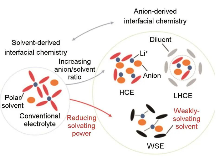 在LIBs中,为了获得更多富含阴离子的溶剂化结构,从而降低阳离子在界面的脱溶剂化势垒进而提高界面的反应动力学,人们通过在常规电解液的基础上大幅提高锂盐浓度或减少溶剂含量,得到了高浓度电解液(HCEs),这导致溶剂分子与Li+的配位摩尔比变小,形成了不同的以Li+为中心的溶剂化结构模型,如图3。在HCEs中,随着自由溶剂分子的减少,在初级溶剂化壳中就会不可避免地出现锂盐阴离子,形成CIPs和AGGs型溶剂化结构,从而实现快速的脱溶剂化过程。高浓度电解液通过提高锂盐阴离子在溶剂化壳层中的浓度以及与溶剂分子、阳离子的络合方式对界面结构、化学组成以及稳定性的影响,不仅改善了低浓度电解液体系的不足,而且在拓宽电化学窗口、防止石墨剥离、抑制铝集流体腐蚀等方面有显著优势。然而,HCEs往往会带来黏度高、润湿性差、离子电导率低和成本高等问题,极大地限制了它在低温下的应用。引入不溶解锂盐的低极性稀释剂来稀释HCEs,实现局部高浓度电解液(LHCEs)。不同电解液浓度下的溶剂化结构和界面模型如图4所示。
