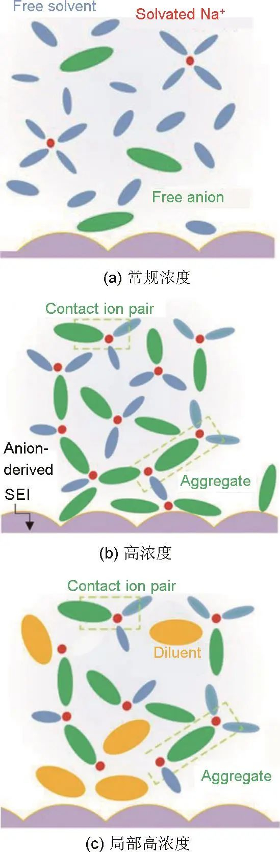 传统电解液、高浓度电解液、局部高浓电解液和弱溶剂化电解液的溶剂化结构示意图
