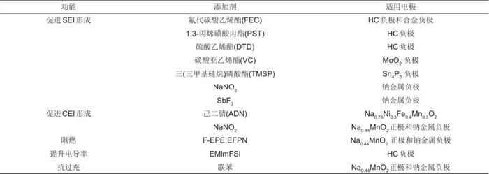 除了通过改善电极/电解液界面进而提升SIBs电化学性能以外,添加剂还可以通过调节电极/电解液处溶剂分子之间的相互作用,进而调节界面的溶剂化结构并提升界面稳定性。Yang等人通过向PC基电解液中引入六氟苯(HFB),通过削弱阳离子与PC分子之间的配位强度,有效抑制了Li+与PC分子在石墨负极上的共嵌入,从而提升了PC溶剂与石墨负极的相容性,提高了界面稳定性。另外,为了防止HFB在电极上发生分解,还可以向体系中引入FEC溶剂。由于FEC的还原电位相较于HFB更高,可以优先在负极上发生还原分解并形成保护性的SEI,进而抑制了HFB的分解。实验结果表明,在使用含有体积分数仅1%HFB的PC电解液的石墨/NCM811软包电池在1150次循环中表现出优异的长期循环稳定性。稳定的界面膜有利于降低钠离子通过的势垒,有利于提升电池的低温性能。一些功能添加剂及其适用的电极体系列于表1中。目前改善电解液低温性能的添加剂主要有腈、有机亚硫酸盐、氟代碳酸乙烯酯(FEC)、碳酸乙烯酯(VC)等,还需要进一步来探索特别适合SIBs的新型添加剂。