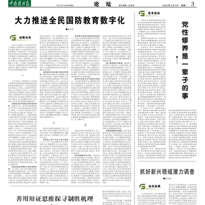 习主席指出:“教育数字化是我国开辟教育发展新赛道和塑造教育发展新优势的重要突破口。”全民国防教育是以爱国主义为核心,以国防和军事为特色,以全民普及、全民参与、全民受益为特征的社会性教育,应深刻认识数字化技术发展给新时代全民国防教育所带来的机遇,研究探索实现数字化发展的方法路径,助力构建面向全民、面向世界、面向未来的国防教育崭新格局。