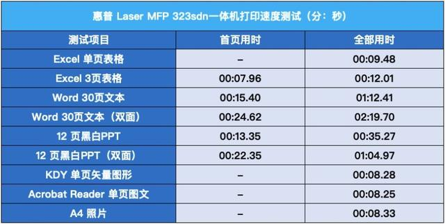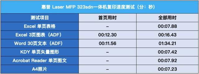下面我们就正式开始对惠普捷系列323sdn黑白激光一体机进行输出速度的测试,在输出速度测试方面我们共分为打印、扫描以及复印三个部分。需要说明的是整个测试过程我们采用PC端USB连接的方式进行测试,这样可以最大程度减少因网络延迟因素造成的误差。并且在打印和扫描测试中,我们是从发送任务开始计算时间,因此首页用时和全部用时是包含了PC端到打印机端的任务传输时间,详细的测试结果如下: