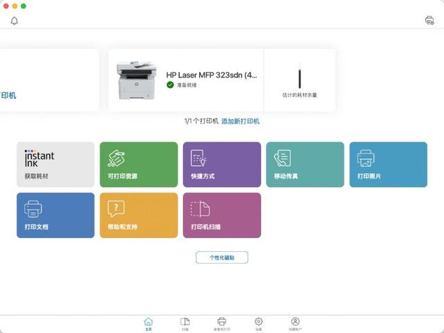 与此同时,这款打印机还能够通过HP Smart应用来完成日常的打印和扫描工作。从HP Smart智能应用的主界面来看,其功能是十分全面的。其中就包含了文档打印、图片打印、文档扫描等常用的功能,可以满足日常的使用需求。由于功能模块之间做了背景色的区分,一眼看上去会更加直观。在软件的最上端,则是可以查看到耗材的剩余情况,这一点对于新手用户来讲十分友好。