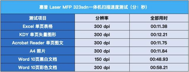 而在扫描方面,300dpi下单页表格的时间在11秒左右。日常无论是扫描表格还是覆盖率较高的图文,甚至是多页文档,这款惠普捷系列323sdn黑白一体机都能在较短的时间完成相应的高质量扫描任务。