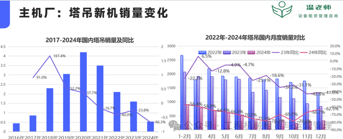 2024年,伴随着房地产市场持续下行探底,塔吊及施工升降机租赁市场大幅下行,存量设备加速出清,新机内销继续暴跌、租金价格持续大跌,出租率随着租赁商主动缩减规模而低位下滑。