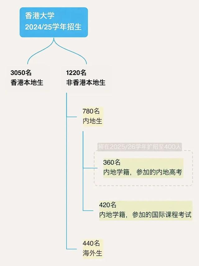 值得特别关注的是,日前,香港大学明确2025/26学年将继续扩招。港大计划在2025/26学年将「内地高考生」的录取名额增加至400人。