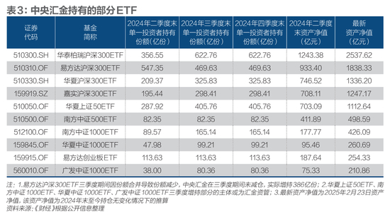 根据基金2024年三季报、四季报整理中央汇金的持仓线索,可发现中央汇金对华泰柏瑞沪深300ETF、华夏上证50ETF、华夏沪深300ETF、嘉实沪深300ETF等多只ETF的加仓份额超过100亿份,并同时对四家公司旗下的中证1000ETF进行不同程度的加仓。