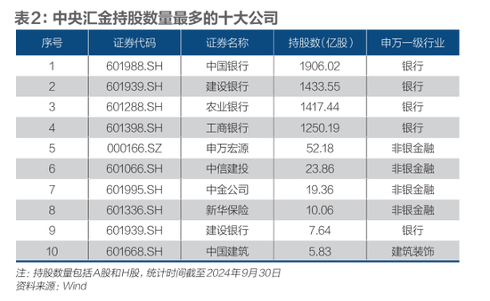 单家公司来看,2024年三季度末,中央汇金持股数量前十大公司中,除了中国建筑,其余均为金融行业,银行、证券、保险分别有四家、三家、两家公司上榜。