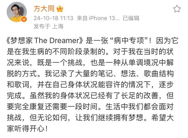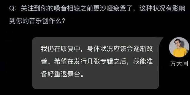 很多网友也发现他在新专辑《梦想家 The Dreamer》里的声音和以前不同了,当时方大同回应自己“仍在康复中”。