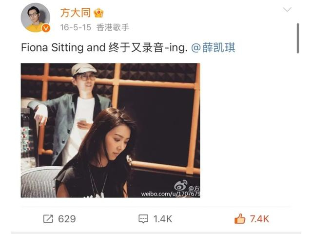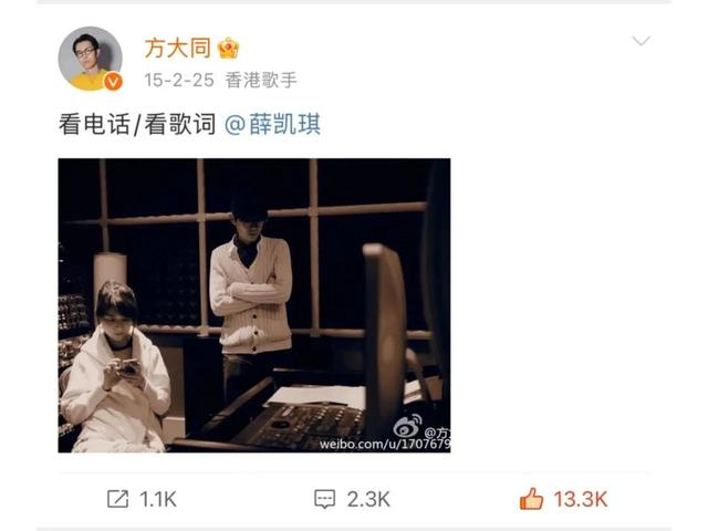 方大同的2313条微博里(统计数据时),有234条提到薛凯琪,转发了185条薛凯琪的微博,直接@薛凯琪8条,转发别人@薛凯琪微博41条,剩下的是吃饭、睡觉、录音。