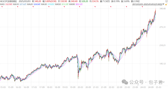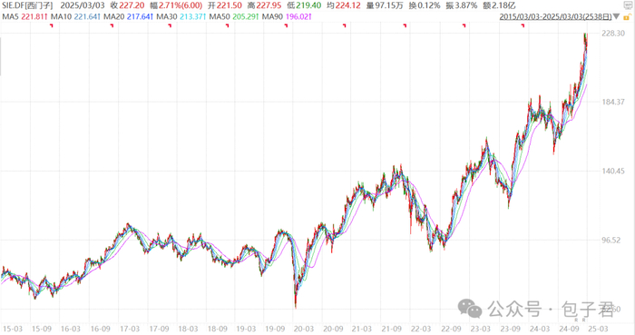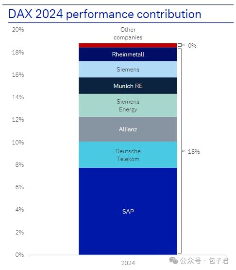 首先,指数成分股中的龙头企业集中度非常高,前6大公司占指数的权重约 50%。事实上,DAX指数的涨幅几乎完全是由少数公司推动的。德股7巨头SAP、德国电信、安联、西门子能源、慕尼黑再保险集团、西门子和德国莱茵金属公司在2024年就贡献了德国DAX指数主要的涨幅。