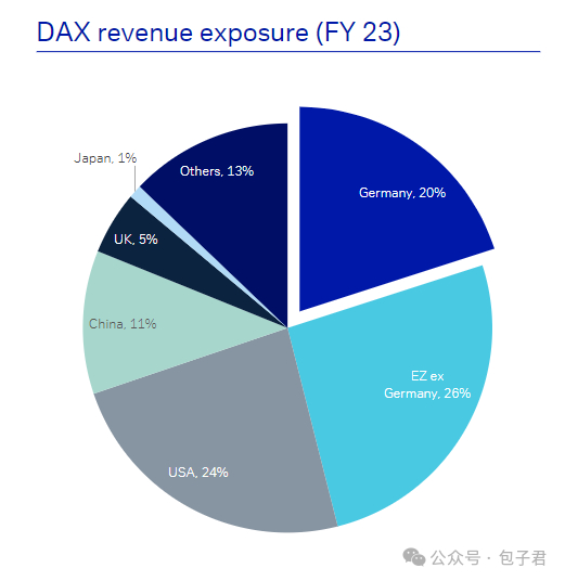 而且,这些德国企业又不是只在德国赚钱,他们是从全球赚钱。德国DAX指数中约80%的成分股收入来自德国以外市场,其中美国占24%,而德国本土仅占20%。也就是,这些公司的业绩情况和德国经济相关度很低。