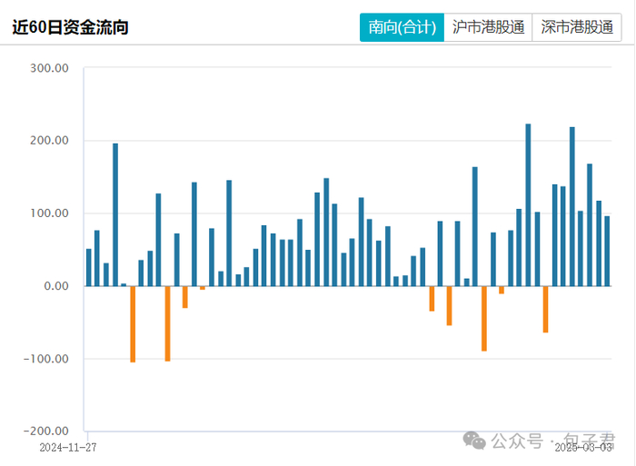 2、今天南下资金净买入港股97.4亿港元,大幅加仓阿里和腾讯,净买入阿里巴巴-W 28.13亿、腾讯控股18.52亿。